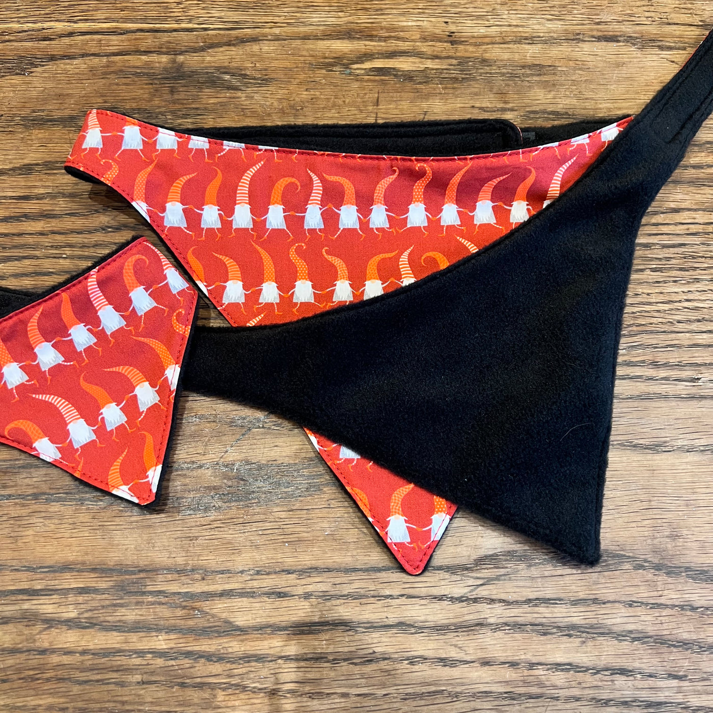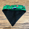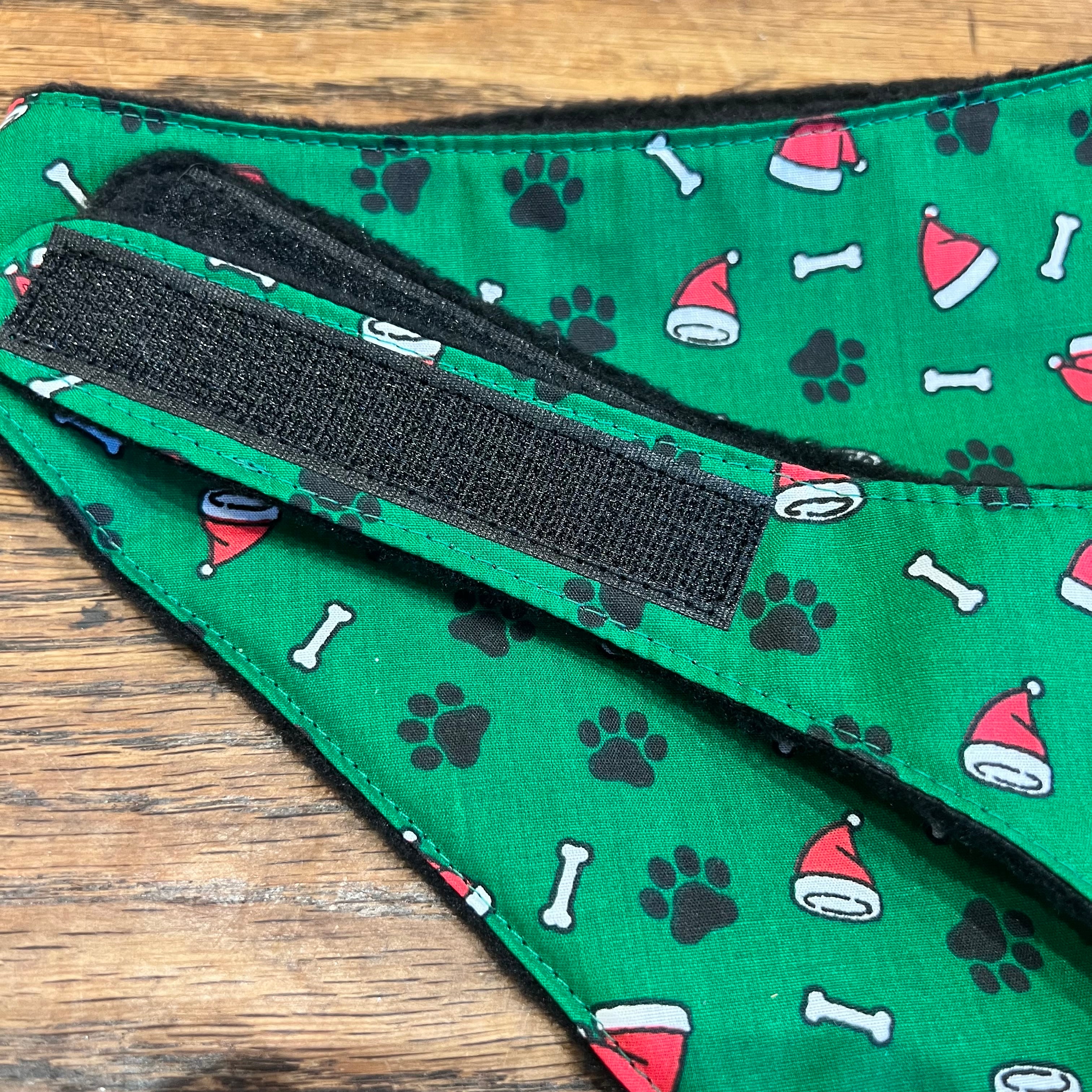 Comfortable fleece backed dog bandanna with our lovely Christmas gnomes or Santa hats and bones , cotton design on the front. Velcro closure for the ultimate quick release adjustability and comfort.